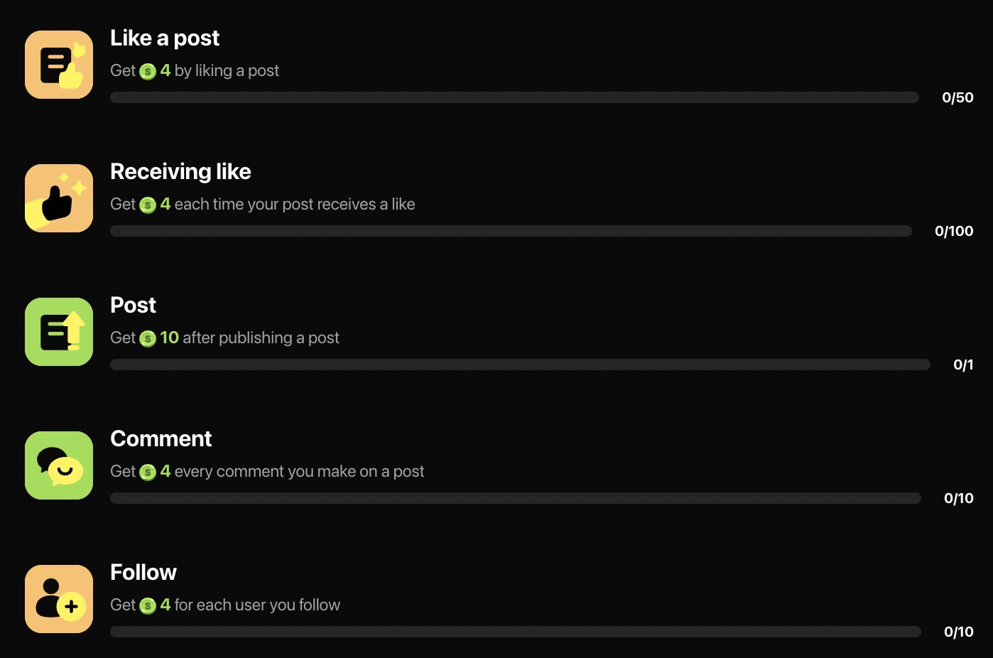 * Completing quests such as giving out likes or publishing a new post